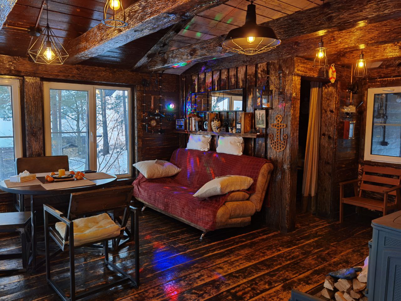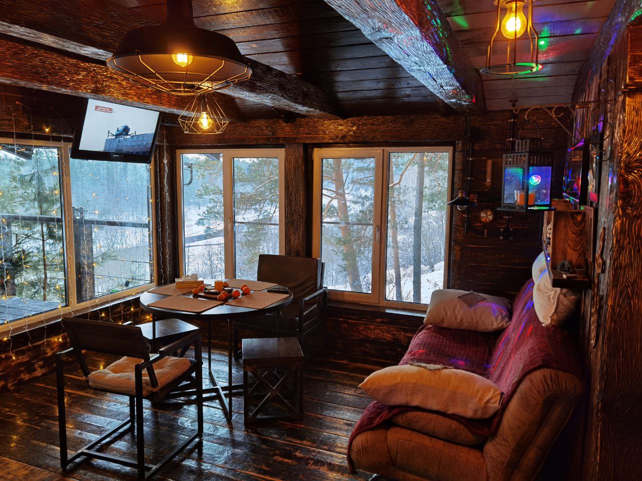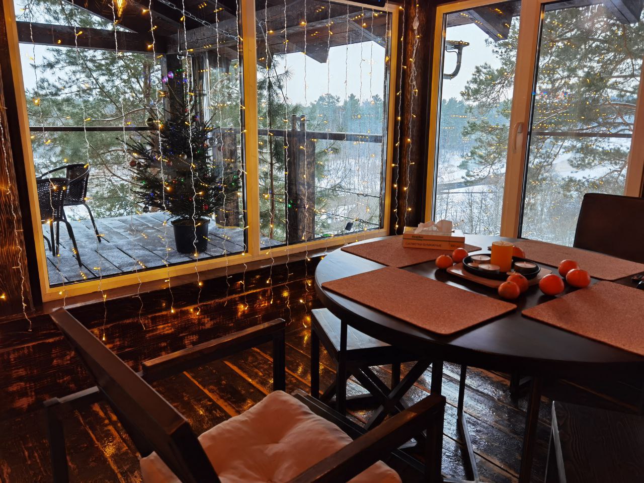 Панорамные окна. Чугунная печь-камин на старинных литых плитах. Балки и опоры из штрабированного бруса. Зональные подсветки. Дровница. Оригинальные подсвечники.
