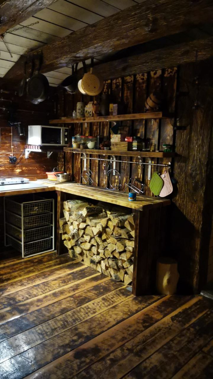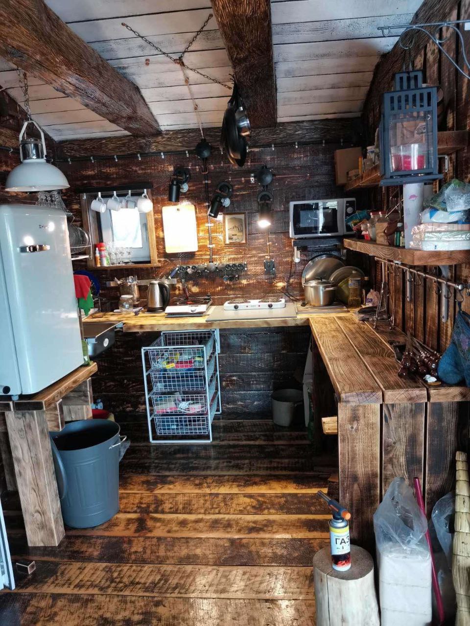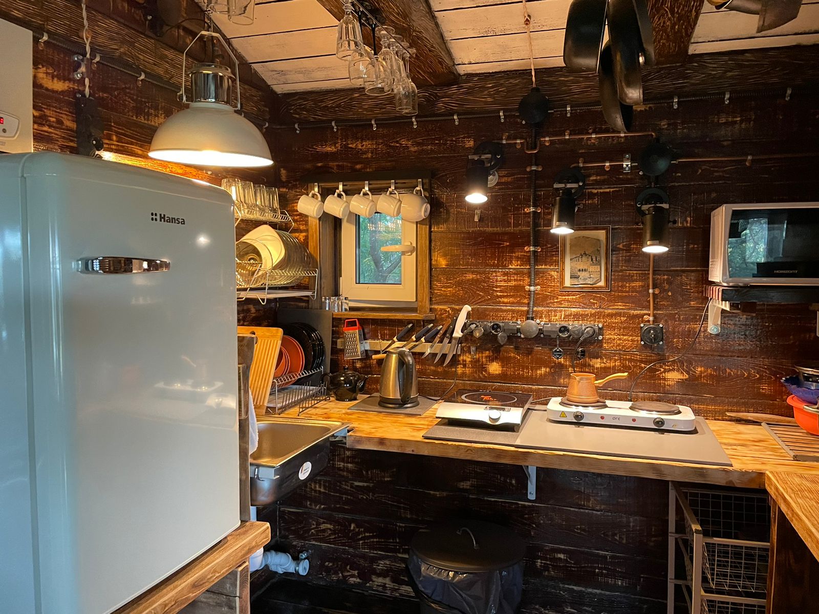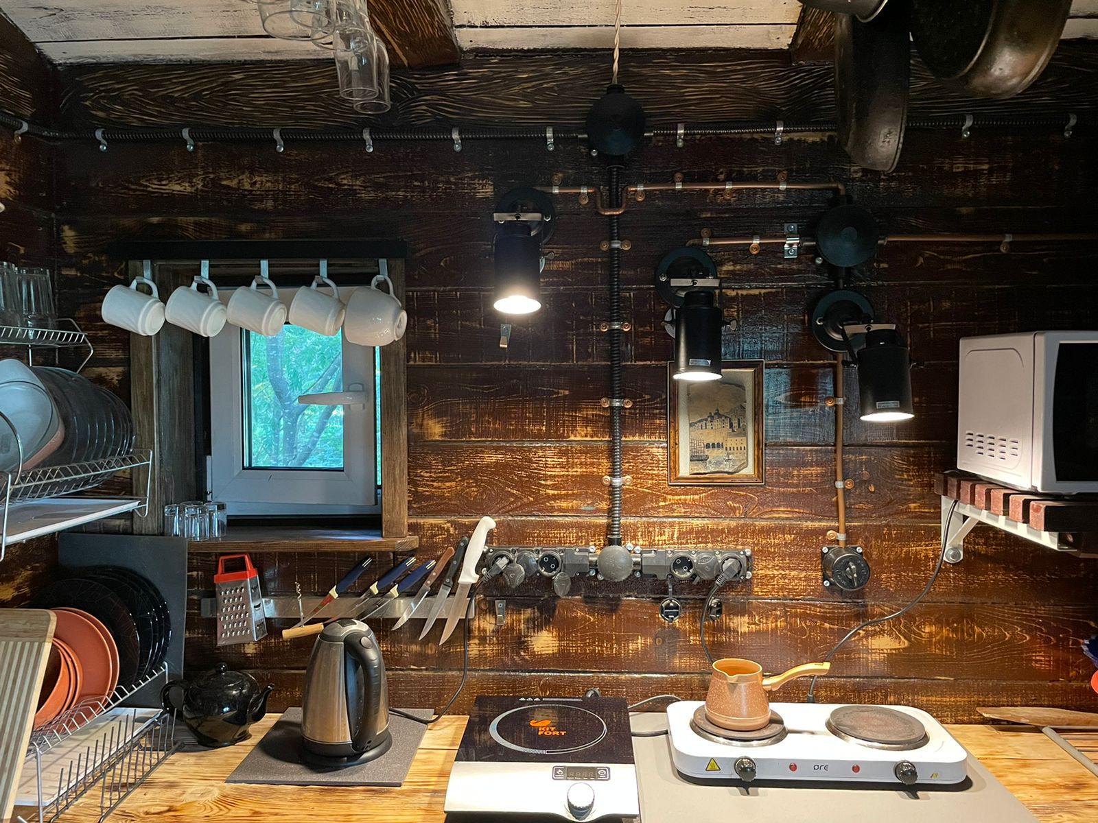 Привычный набор кухонной техники. Холодильник. Электрическая и индукционная плиты. Микроволновка. Чайник. Кофемолка. Посуда. Столовые приборы. Бокалы.